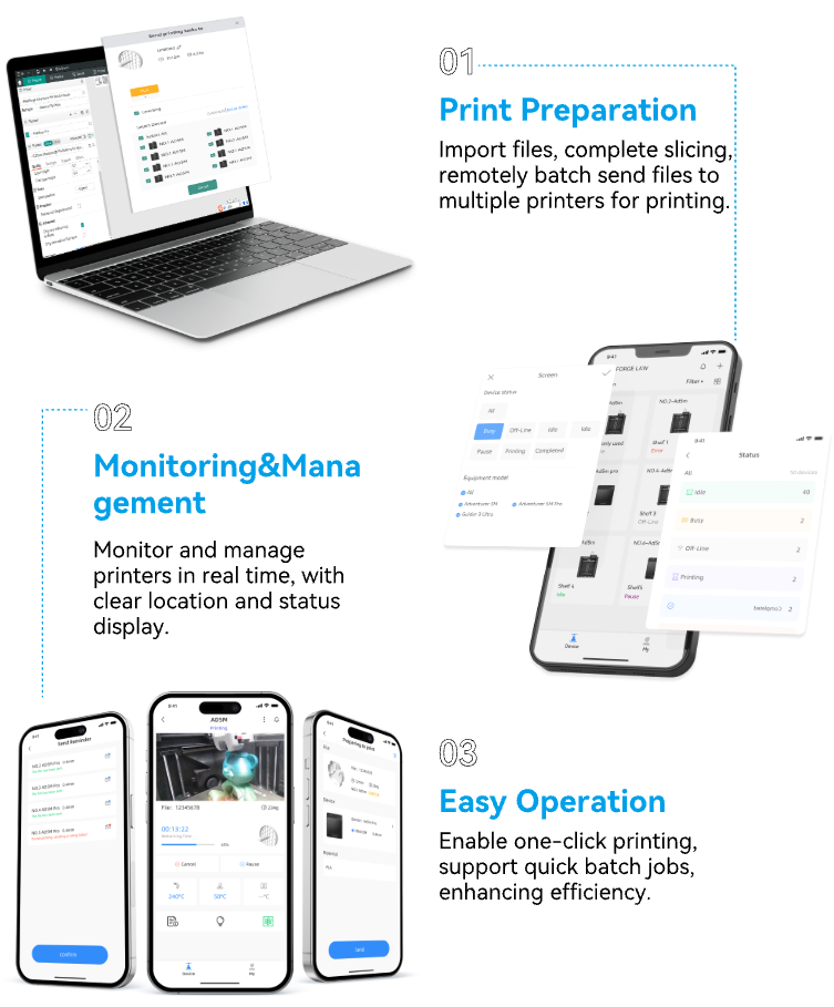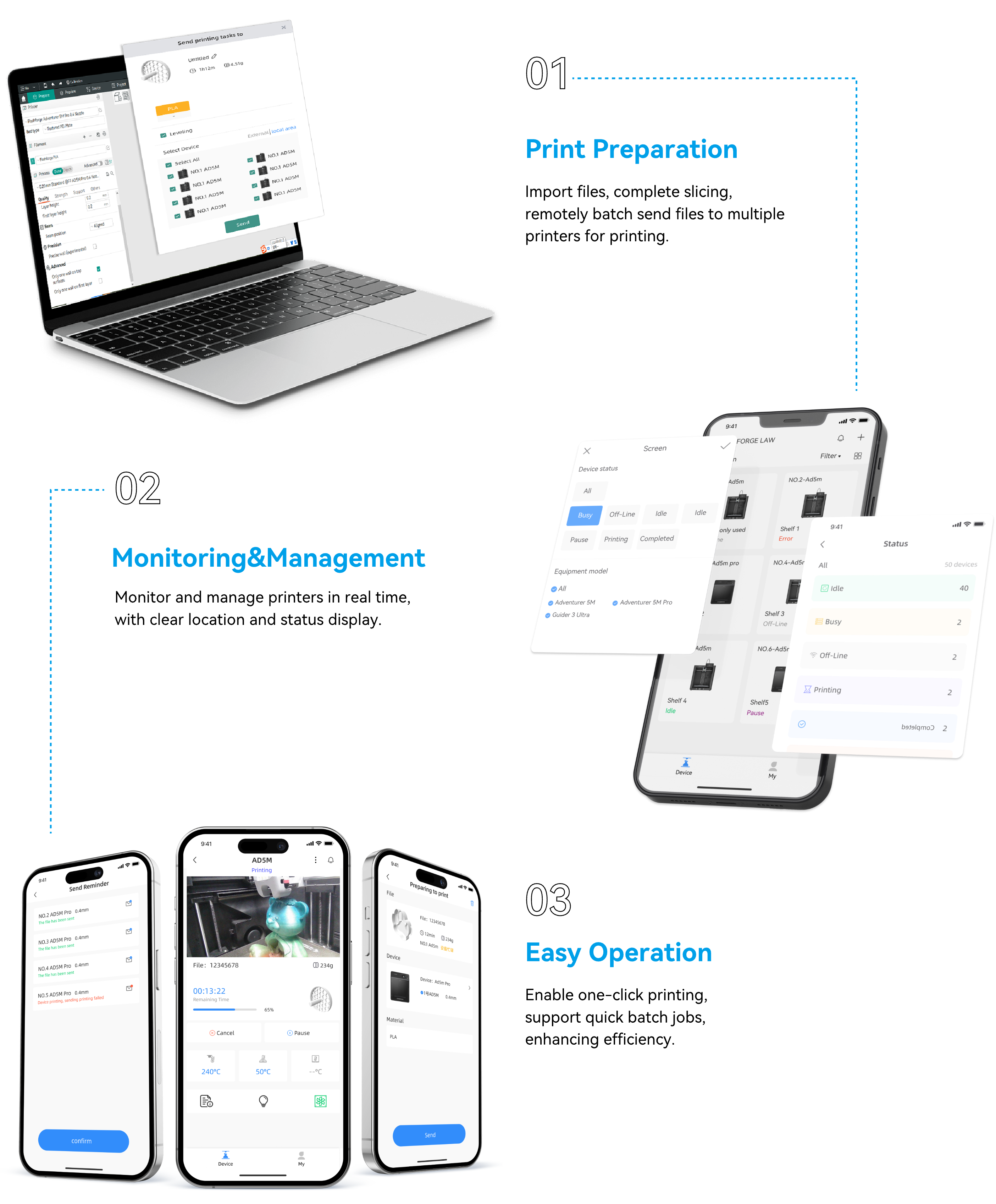 Pas besoin d'être attaché à votre imprimante, liez une ou plusieurs imprimantes 3D pour afficher les mises à jour en temps réel, y compris la progression de l'impression et les détails du matériau, où que vous soyez