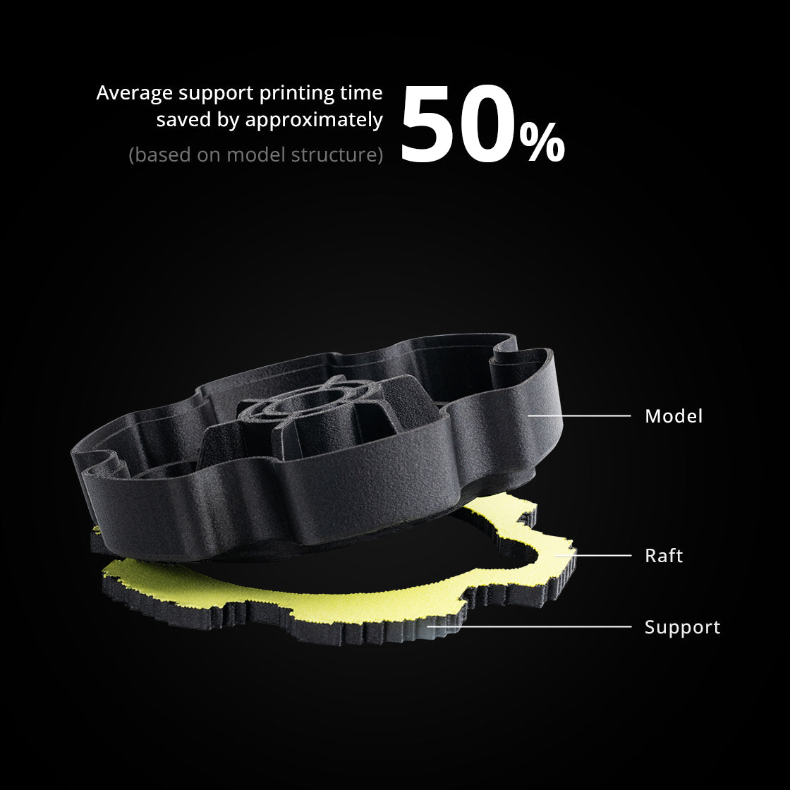 Le support est imprimé avec le même matériau que le modèle, minimisant les changements d'extrudeuse et réduisant le temps d'attente.