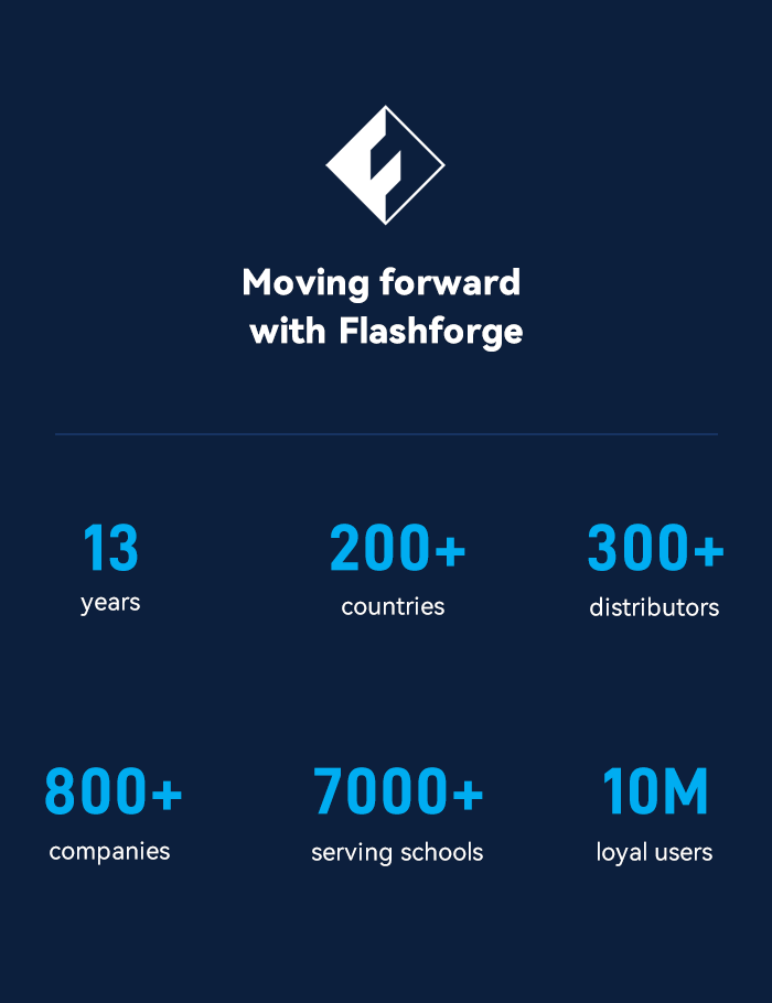 Over the past 13 years, Flashforge has earned the trust of nearly a million users across 200+ countries. With every new innovation and expanded market, our commitment to leading the 3D printing industry has only grown stronger. Backed by 134 national patents and 36 software copyrights, our products have been recognized as world-class. Our extensive R&D network drives constant innovation, and our ISO 9001 certification guarantees the highest quality standards.