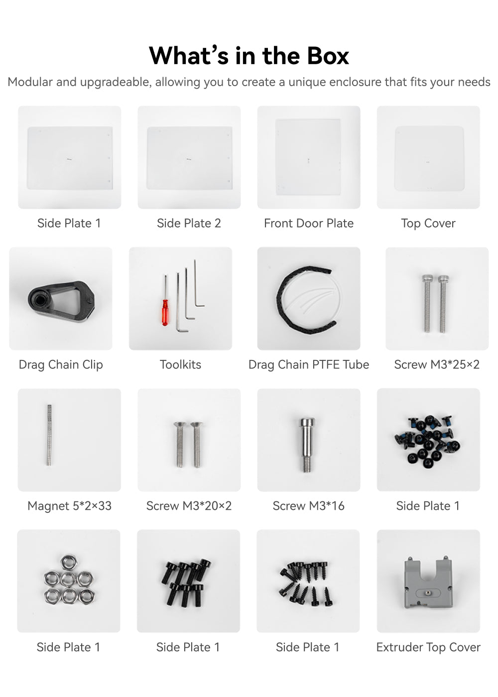 The AD5M Enclosure Kit contains all non-3D printed parts needed to assemble an AD5M Enclosure Edition.To complete the entire assembly, please visit the Flashforge official website - Download Center - download the model file and print the remaining parts.