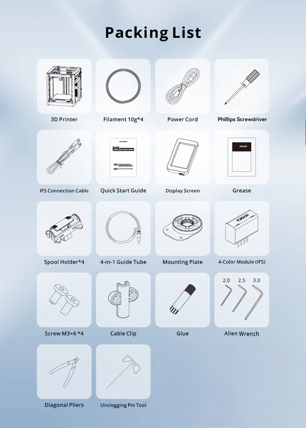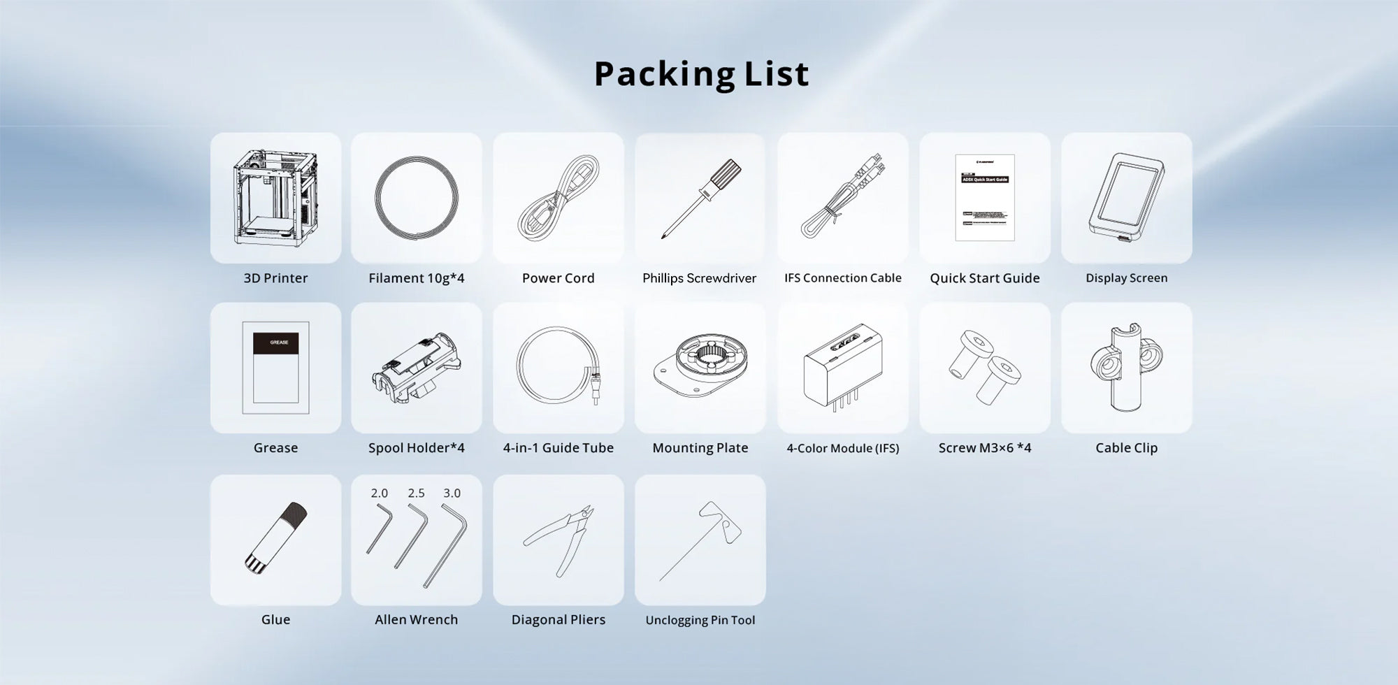 Simply install the screen, filament holder, and multicolor printing module. All is done.