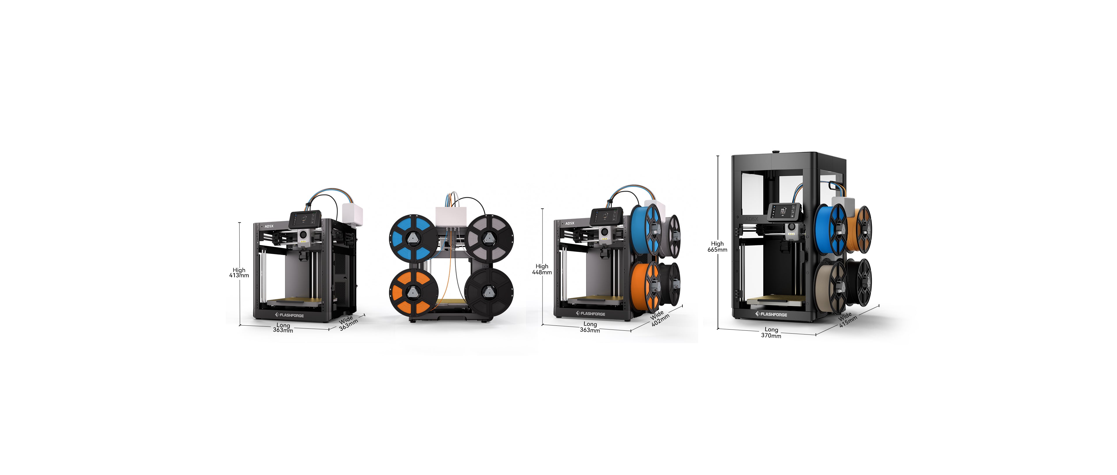 Four spools of filament arranged side by side, effectively reducing storage space and allowing for more flexible placement.